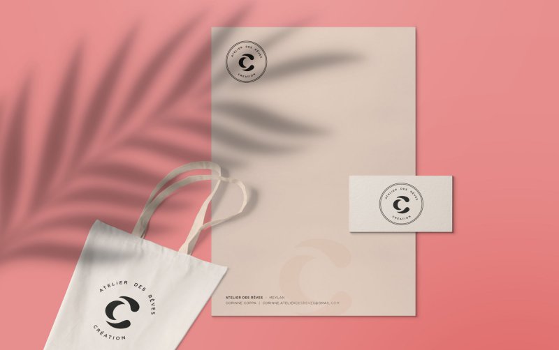 La cliente souhaite que la lettre C soit la base graphique de son identité ; pour elle le logo devient un objet à part entière, en fonction du support : élément de décor d'un sac, carte, porte clés, ...
