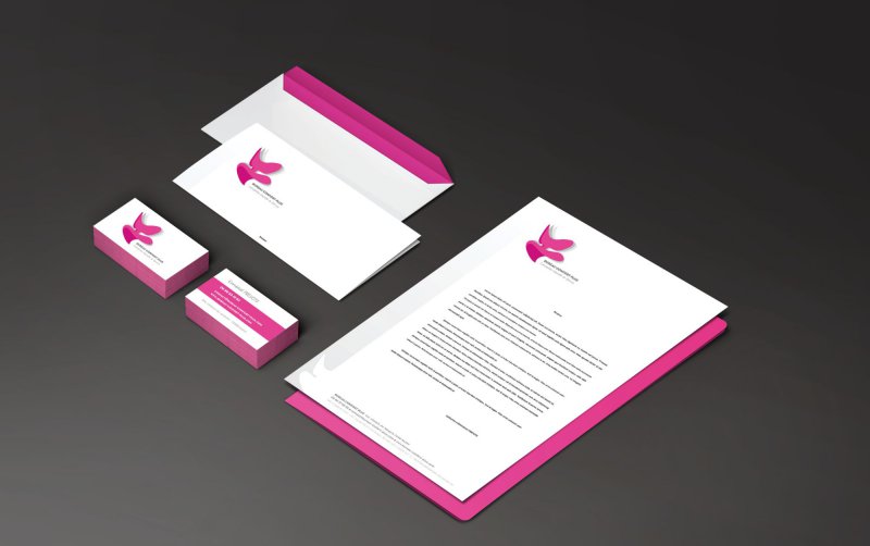 Réalisation de la carte de visite -finition vernis sélectif- et de l'ensemble de la papeterie.
