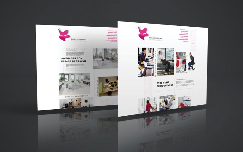 L'identité visuelle de Bureau Confort Plus se décline également sur la plaquette commerciale. Des images sélectionnées avec attention et une mise en forme aérée pour apporter au lecteur l'essentiel des informations.
