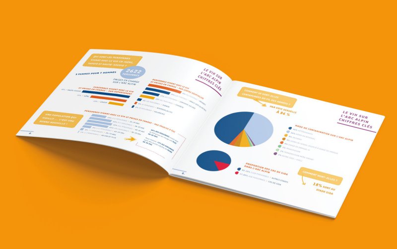 Création de l'identité visuelle propre à ce support. Utilisation de couleurs vives pour un rendu agréable à lire, explicite et accessible à toutes les personnes qui auront ce rapport entre les mains et qui ne sont pas forcément des professionnels de santé. La matière de l'image utilisée sur la couverture est un clin d'oeil à la matière organique.