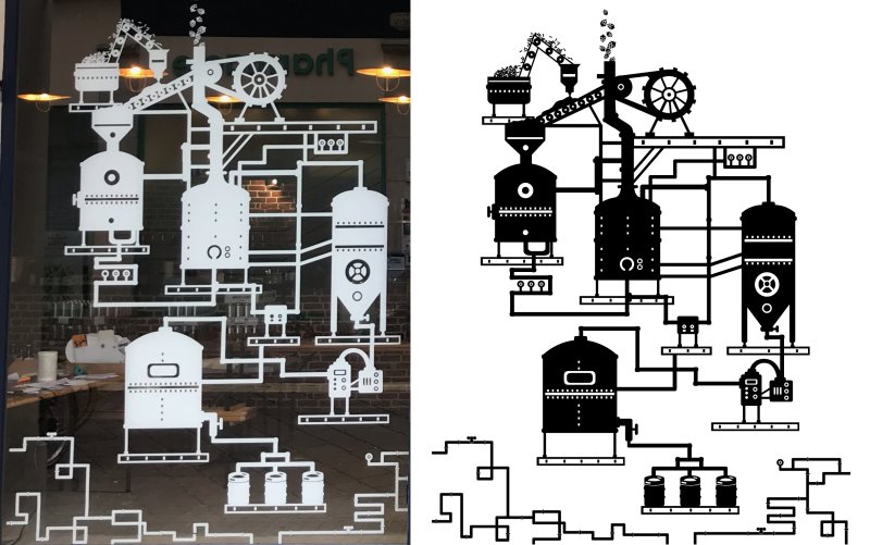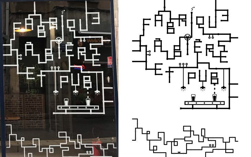 Création des vitrophanies qui illustrent les étapes de fabrication de la bière artisanale et le côté pub du lieu.