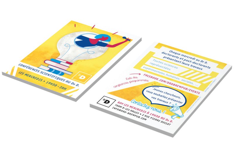 Les bières brassées au Dr D. sont parfois des bières ephémères. Pour immortaliser ces créations, le studio Vitamine C réalise des illustrations adaptées à chaque brassin, déclinées en sous-bock et parfois sur des tote-bags.
