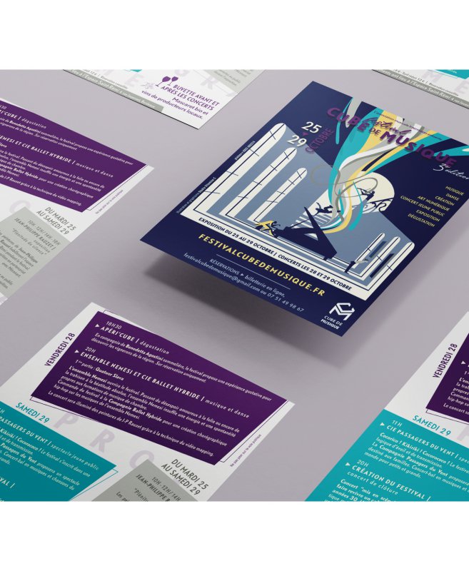 J’ai souhaité travailler sur un monogramme afin d’apporter du caractère et une certaine prestance à l’identité visuelle du festival. Il me semblait évident de composer ce monogramme à partir du C de cube et du M de musique. Dans mon idée, il n’était pas nécessaire que l’on reconnaisse ces lettres au premier coup d’oeil mais plutôt qu’elles constituent la base pour laisser libre champ d’interprétation à chacun.