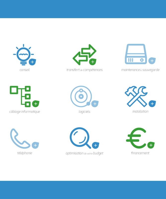 Mise en place d'une identité visuelle, utilisation de la forme "goute" du logo pour les boutons, illustration des prestations sous forme de pictogrammes.